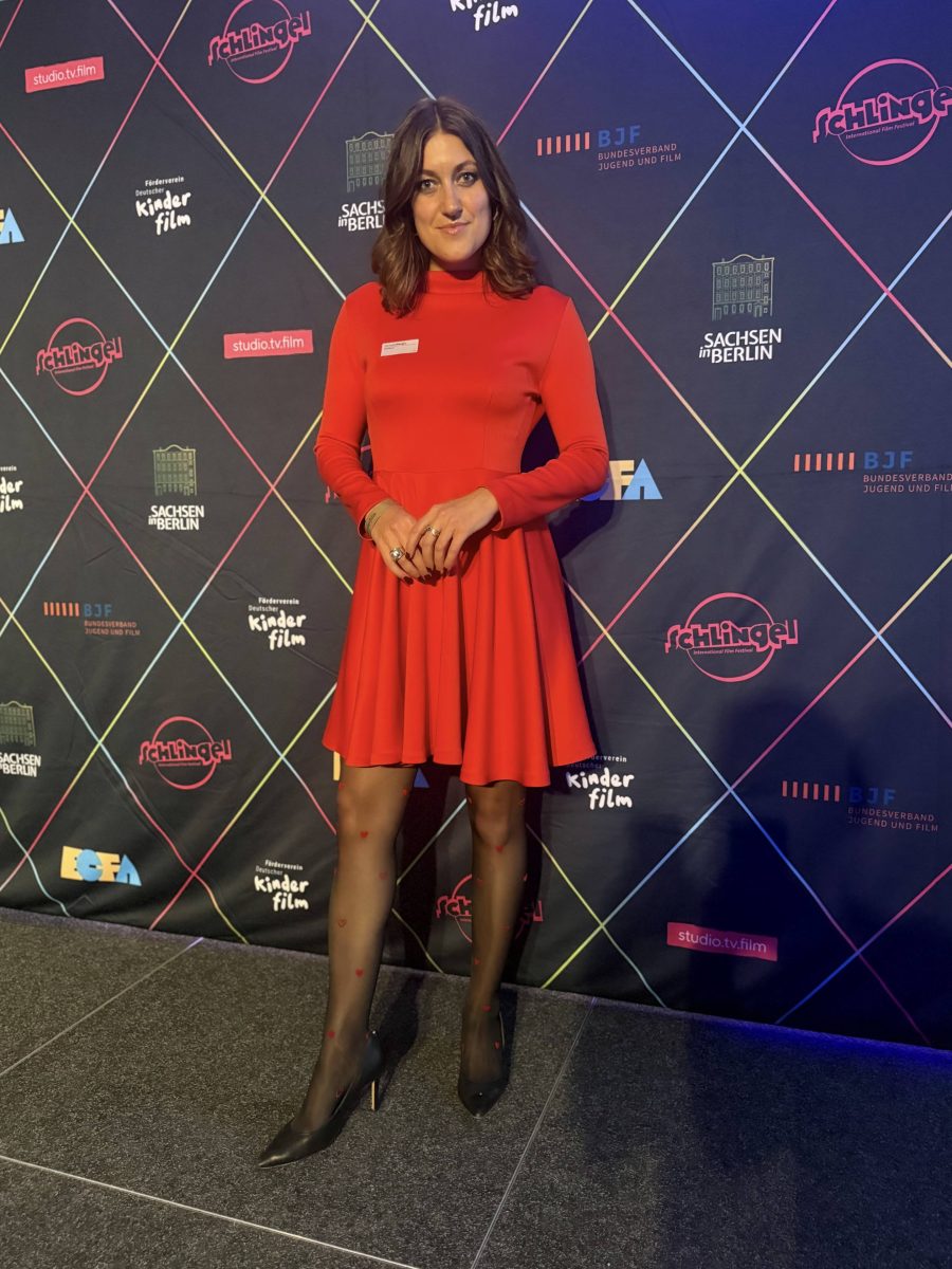 Her second outfit, the SCA Scuba Lux Red Dress in the style of Jackie O, is made of scuba fabric with a perfectly flattering silhouette that Manuella confidently showcased at the European Children’s Film Association event for the Swiss Film School during the 76th Berlinale Film Festival.