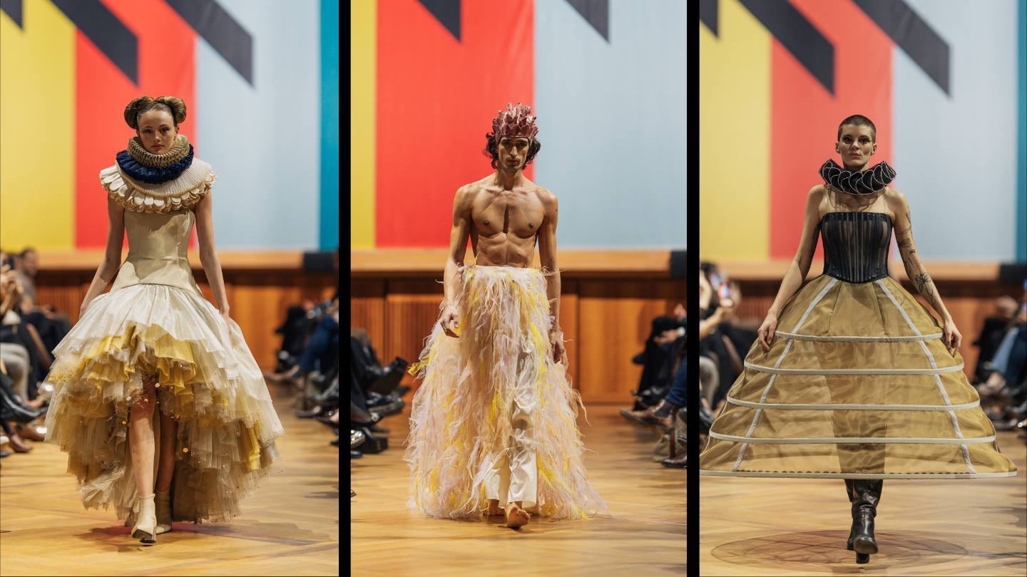 The historic Swiss School of Fashion and Design, founded in 1889, presented exclusive archival one-of-a-kind pieces under the label MODECO COUTURE by THEATERSCHNEIDEREI. The collection demonstrated the creative strength and technical precision of theatrical tailoring: historic construction techniques, sharply defined silhouettes, and elaborately crafted pieces originally developed for stage, film, and television.